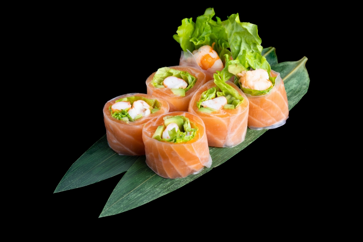 Яркий, свежий и полезный ролл с креветками, лососем, авокадо и листьями салата