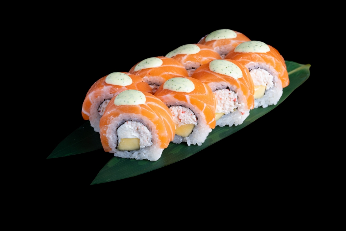 Нежный лосось в сочетании со сливочным сыром, манго, сурими и зеленым соусом