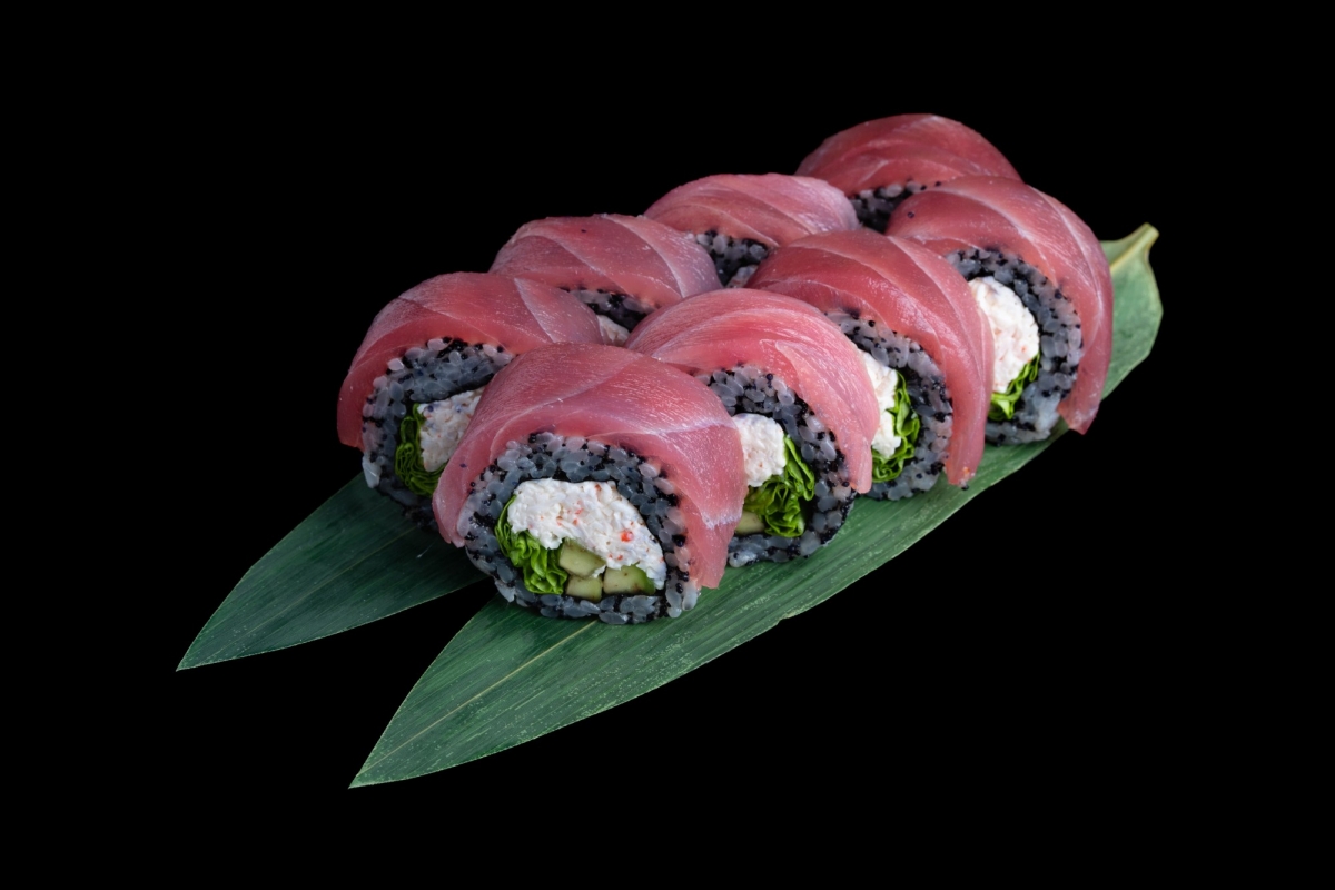 Холодный ролл с тунцом, икрой масаго, авокадо, сурими, листьями салата и сливочным сыром