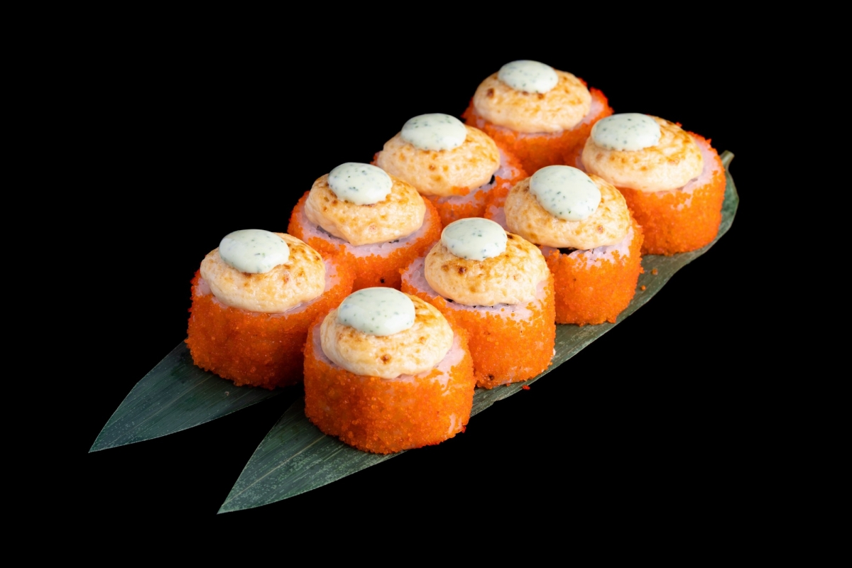Запеченный ролл с нежным лососем, свежим огурчиком, зеленым луком, икрой масаго, зеленым соусом и сливочно-чесночной шапочкой